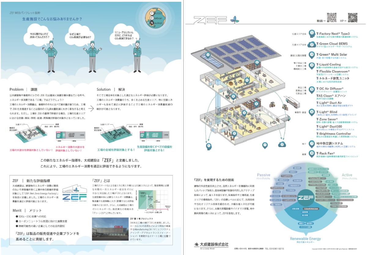 大成建設株式会社全国建築分野ではZEB/ZEHの普及が進む中、2050年カーボンニュートラル達成には、工場のエネルギー消費量削減による脱炭素化が不可欠である。そこで、ZEBの定義を拡張し、工場の省エネや再エネの効果を正しく評価できる「ゼロエネルギーファクトリー(ZEF)」指標を独自に構築した。この指標を実案件に導入し、得られた知見と成果を積極的に他の工場へ普及展開することで、持続可能な製造業の未来を築いている。
